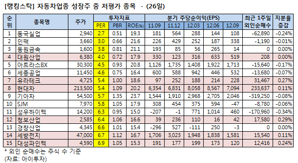 자동차 업종 성장주 중에서 PER(주가수익배수) 기준으로 가장 저평가된 종목은 케이비아이동국실업477원, ▲8원, 1.71%으로 나타났다. 이는 지난 26일 종가 기준, 자동차 업종 성장주 중 대표적인 저평가 지표인 PER이 낮은 종목 15개를 선정한 결과에 따른 것이다.