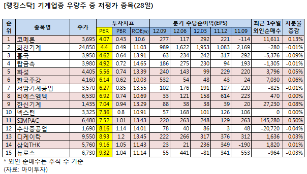 [랭킹스탁] 저평가 우량주 15선-기계업종