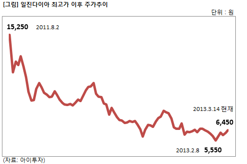 일진다이아가 그간 약세를 지속한 것은 실적 부진에 따른 것으로 풀이된다. 이 회사의 지난해 매출은 933억원으로 전년 대비 4% 증가했으나, 영업이익은 89억4500만원으로 42% 감소했다. 순이익(자회사 손익 반영) 또한 35% 줄어든 78억3100만원을 기록했다. 이는 세계적인 경기 침체로 주력 제품인 공업용 다이아몬드의 수요가 감소했기 때문이다.