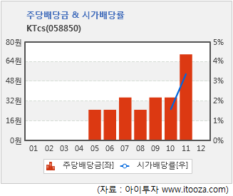 KTcs는 배당 매력도 있다. 이 회사는 지난해 주당 배당금으로 100원을 책정했다. 이는 전년 대비 30원 늘어난 수준으로, 시가배당률은 4.3%다. KTcs는 2005년부터 배당금을 꾸준히 지급해왔으며, 특히 2011년엔 주당 배당금 규모가 전년 대비 2배 이상 커지기도 했다. 배당성향도 2009~2010년 11%에서 2011년 15%, 지난해 22%로 올라갔다.