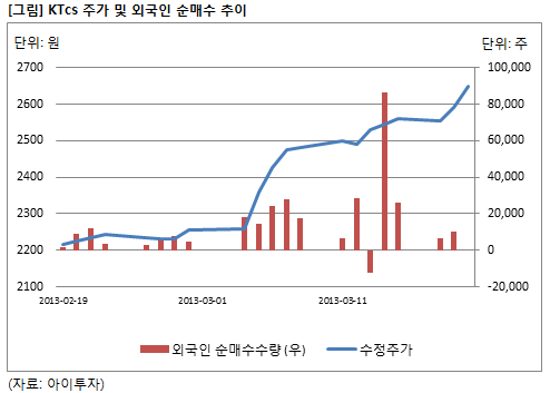 KTcs2,855원, ▲10원, 0.35%가 외국인으로부터 러브콜을 받아 관심을 끈다. 20일 오전 11시 35분 현재 주가는 전일 대비 2.3% 오른 2650원이다.