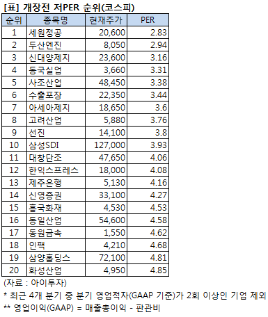 이날 개장 전 아이투자가 코스피 상장사의 PER를 집계한 결과 세원정공의 PER이 2.83배로 가장 낮은 것으로 나타났다. PER은 개장전 시가총액을 최근 12개월 합산 순이익(연결 지배주주 혹은 지분법적용순이익)으로 나눠 구했다.