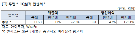 증권가는 올 1분기 루멘스의 실적이 개선될 것으로 보고 있다. 증권정보업체 와이즈에프앤(WiseFn)에 따르면 최근 3개월 간 증권사가 전망한 루멘스의 1분기 매출액 평균치는 1163억원, 영업이익은 81억원이다. 매출액은 전년 동기보다 37%, 영업이익은 47% 늘어난 규모다.