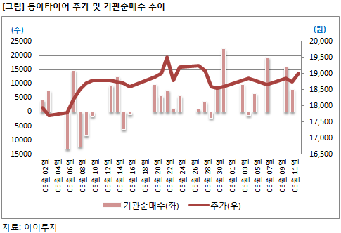 지난달부터 기관은 동아타이어 주식을 꾸준히 늘렸다. 5월 2일부터 전일까지 기관의 누적순매수 규모는 12만7561주로 상장주식수의 0.53%다.