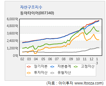 동아타이어는 8개의 종속회사를 두고 있다. 보유하고 있는 자회사 지분가치만 1557억원으로 자산 대비 26%다. 아이투자에서 제공하는 'V차트(Value_Chart)' 중 "자산구조지수" 차트를 보면 투자자산 비중이 상당한 것을 알 수 있다. 자회사 대부분은 자동차용 튜브·부품 사업을 하고 있다. 이 중 동아타이어의 지분법 순이익에 크게 기여하는 업체는 디티알, 동아전지, 동아윤태유한공사로 압축된다.