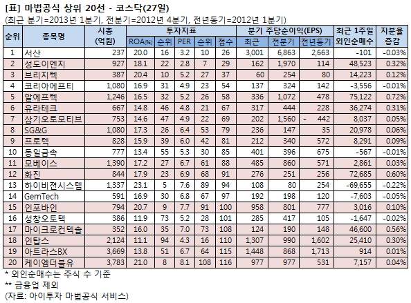 코스닥 기업 중에서 마법공식 종합순위 1위에 오른 종목은 서산1,467원, ▼-22원, -1.48%으로 나타났다. 이는 지난 27일 종가로 결정된 순위에 따른 것이다.