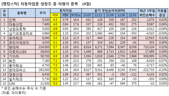 이 가운데 인팩6,040원, ▼-130원, -2.11%의 PER이 4.3배로 자동차 업종 성장주 중에서 가장 낮았다. ROE는 18.4%, PBR은 0.79배다.