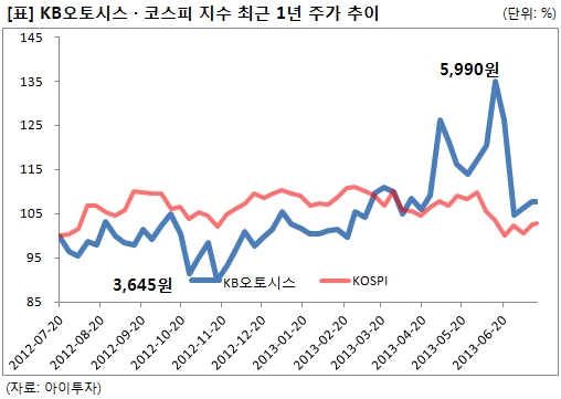 KB오토시스3,395원, ▼-15원, -0.44%의 주가가 반등하고 있다. KB오토시스의 주가는 지난 6월 5990원으로 52주 최저가 대비 64% 급등했으나 이후 주가가 4430원까지 급락했다. 최근에야 다시 반등을 시작해 현재 KB오토시스는 전일 대비 0.8% 상승한 4670원대에 거래되고 있다. KB오토시스의 최근 1년간 수익률은 코스피 지수를 5%p 상회했다. KB오토시스는 다시 시장 인기주식으로 부활할 수 있을까.