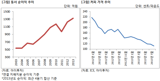 동서의 2분기 순이익이 늘어난 것은 원재료 값 하락과 경쟁사의 경쟁력 약화로 동서식품의 실적이 개선된 결과로 풀이된다.
