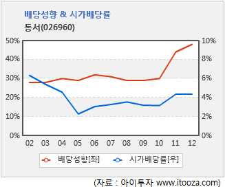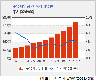 이런 가운데 동서는 배당 매력도 보유하고 있다. 이 회사는 지난 10년간 배당금을 꾸준히 늘려왔다. 2002년 227원이었던 주당배당금은 지난해 800원까지 증가했다. 시가배당률 또한 2005년을 제외하고 3% 이상을 유지해왔다. 동서의 배당성향은 상장 초기부터 2010년까지 30% 수준이었으나, 지난해엔 48%로 한 단계 올라섰다. 만약 올해 주당배당금이 지난해와 동일하게 책정된다면, 전날 종가 기준 예상 배당수익률은 2.8%다. 이는 은행 정기 예금금리와 비슷한 수준이다.