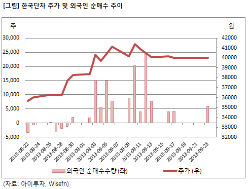 한국단자61,500원, ▲1,700원, 2.84%가 외국인으로부터 러브콜을 받아 관심을 끈다. 24일 오전 11시 6분 현재 주가는 전일과 동일한 4만원이다.