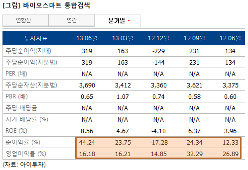 7일 아이투자(www.itooza.com) 통합검색에 따르면 바이오스마트의 최근 분기(13.2Q) 영업이익률은 16%, 순이익률은 44%를 기록했다. 차이는 28%p에 달한다. 앞선 4개분기를 살펴보면 지난해 4분기와 2분기에는 영업이익보다 낮은 순이익률을 기록했다. 특히 지난해 4분기의 경우 영업이익률은 14%였으나 순이익률은 -17%로 31%p의 차이를 보인다.