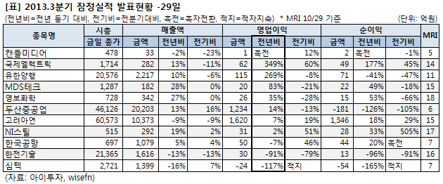 이날 개별 기준 잠정실적을 발표한 기업은 모두 11개다. 전년 동기 대비 영업이익이 가장 크게 증가한 기업은 국제엘렉트릭이다. 3분기 잠정 영업이익이 전년 동기 대비 약 4배 늘어난 62억원을 기록했다. 캔들미디어는 흑자 전환했다.