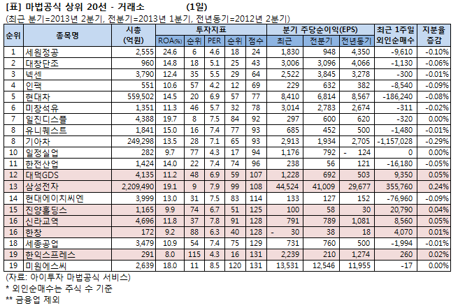 그 외 대창단조6,440원, ▲30원, 0.47%, 넥센5,700원, ▲100원, 1.79%, 인팩6,040원, ▼-130원, -2.11%, 현대차261,500원, ▲4,000원, 1.55%, 미창석유109,200원, ▲700원, 0.65%, 일진디스플902원, 0원, 0%, 유니퀘스트6,010원, ▲80원, 1.35%, 기아차, 일정실업18,550원, 0원, 0%가 거래소 상위 10선에 포함됐다. 연결 지배지분 또는 지분법이 적용된 순이익과 자본을 적용해 투자지표를 산출했다. 분할 등으로 일시적인 이익이 발생했던 기업은 제외했다.