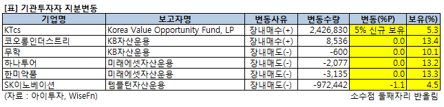 코리아 밸류 오퍼튜니티 펀드(Korea Value Opportunity Fund, LP)는 KTcs2,855원, ▲10원, 0.35% 주식 242만6830주를 신규 매수해 지분 5.3%를 확보했다. 이 회사는 미국 국적 법인으로 5% 신규 보유 공시를 한 국내 기업은 KTcs2,855원, ▲10원, 0.35%가 처음이다.