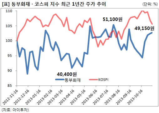 동부화재의 주가가 반등하고 있다. 동부화재의 주가는 지난 1년간 4만원~5만원 사이에서 박스권 움직임을 보였다. 최근 주가 반등으로 52주 최고가 대비 4% 낮은 4만9150원대에 거래되고 있다. 동부화재의 최근 1년간 수익률은 시장수익률을 3%p 하회했다. 동부화재의 주가상승은 계속될 수 있을까.
