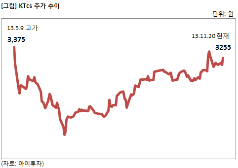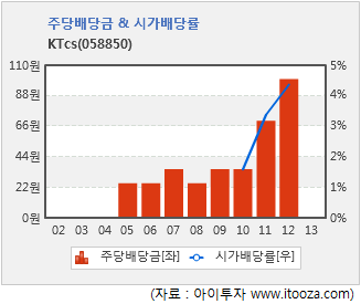 KTcs는 풍부한 현금을 바탕으로 배당도 지급한다. 특히 2011년부터는 주주이익 환원 정책을 강화하면서 배당금을 증액했다. 만약 올해 주당배당금이 지난해와 동일한 100원으로 책정된다면, 현재가 기준 예상 배당수익률은 3.1%다.