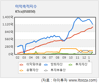 KTcs는 서비스업을 영위해 원재료 구매와 설비투자가 필요없다. 따라서 이익이 안정적으로 발생하며, 이 이익은 고스란히 현금성자산으로 쌓인다. 실제 아이투자가 제공하는 'V-Chart 이익축적지수'를 보면 이익잉여금이 꾸준히 당좌자산으로 축적되는 것을 확인할 수 있다.