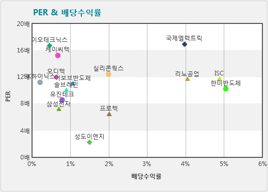 한미반도체는 반도체 장비업체 중에서 배당금을 많이 주기로 유명한 회사다. 아이투자에서 개발한 주가수익배수(PER) & 배당수익률 매트릭스 차트에 따르면 한미반도체는 상장된 반도체와 반도체 장비업체 중에서 차트의 4사분면에 가장 가까운 위치에 속한다. 이 영업이익은 업종 내에서 PER이 낮고 배당수익률이 높은 기업이 포함된다. 한미반도체의 현재 PER은 10.2배, 3년 평균 배당수익률은 5%다.