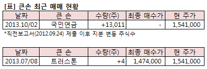 지난 9일 국민연금공단은 롯데칠성 보유지분율을 종전 9.09%에서 10.14%로 1.05%P 확대했다고 공시했다. 국민연금공단은 직전 보고서 기준일인 2012년 9월 24일 이후 롯데칠성 주식 1만3011주를 추가 매수했다. 보유지분율이 10% 이상이 됨에 따라 국민연금공단은 롯데칠성의 주요주주가 됐다.