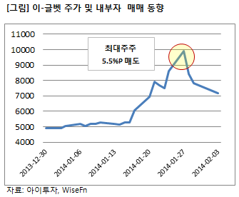 이-글벳 최대주주 일가는 더 큰 수익을 냈다. 내부자의 평균 매도가는 주당 9375원으로 지난 16일 종가 대비 78% 높다. 매도 규모가 39만여주임을 감안하면 이 기간 수익 증가분은 16억원을 넘는다.