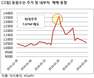 이에 앞서 동원수산6,025원, ▼-15원, -0.25%의 최대주주 일가도 보유 지분을 대거 팔아 치웠다. 이 회사 최대주주인 왕기철 대표 및 친인척은 회사 주식 26만5200주를 장내 매도했다. 발행주식수의 무려 7.07%에 해당하는 물량이다. 처분일은 지난달 20~22일이며, 평균 매도 단가는 1만3350원이다.