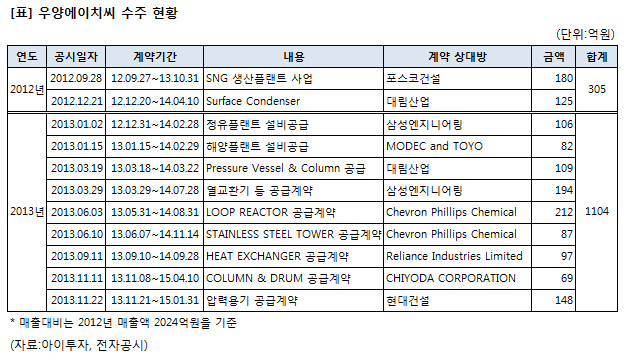 회사측에 따르면 매출 증가의 원인은 수주 증가다. 실제 우양에이치씨는 지난해 총 9건의 수주 공시를 냈다. 2012년에는 단 2건의 수주 공시가 올라왔을 뿐이다. 지난해 공시한 수주계약 금액은 1104억원으로 2012년 수주 계약 금액 305억원 보다 262% 증가했다. 대부분의 수주는 지난해부터 올해에 걸쳐 진행된다. 이중에서 지난해 1월 2일 수주한 106억원 규모의 정유플랜트 설비 공급과 1월 15일 수주한 82억원 규모의 해양플랜트 공급 매출액은 대부분 지난해 반영됐다.