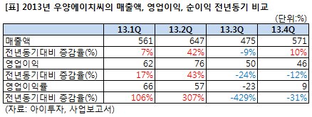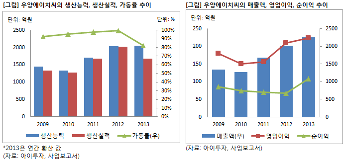 실제로 그동안 우양에이치씨는 생산능력 확대와 함께 생산실적도 꾸준히 늘렸다. 2009년 1449억원이던 생산능력은 2012년 2038억원으로 41% 늘었다. 같은 기간 생산실적도 1339억원에서 2024억원으로 51% 증가했다. 이에 따라 생산능력 대비 생산실적을 기준으로 산출한 가동률은 100%에 육박했다. 이 결과 지난해 매출액은 51% 늘어난 2024억원을, 영업이익은 16% 증가한 209억원을 기록했다.
