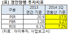 실적 증가로 경인양행의 투자지표도 개선됐다. 1분기 실적을 반영한 현재 PER(주가수익배수)은 17.4배로 지난해 연간 실적 기준 20.8배보다 낮아졌다. 동일 기준으로 PBR(주가순자산배수)은 종전 1.28배에서 1.27배로 낮아졌고, ROE(자기자본이익률)는 6.1%에서 7.2%로 높아졌다.