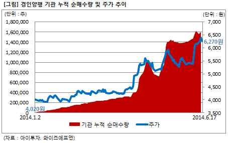 주가 상승을 이끈 것은 기관투자자다. 증권업계에 따르면 올 들어(1.2~6.18) 기관은 이 회사 주식 159만400주를 순매수했다. 총 발행주식 수의 3.9%에 해당하는 물량이다. 최근 1개월간(5.18~6.18)도 16만8610주(0.4%)를 매수하며 '사자세'를 지속했다.
