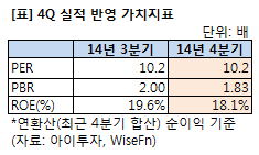 지난해 4분기 실적을 반영한 주가수익배수(PER)는 10.2배다. 주가순자산배수(PBR)는 1.83배, 자기자본이익률(ROE)은 18.1%다.