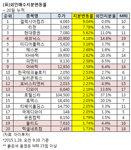 갤럭시아컴즈 리젠 현대증권 세코닉스 미디어플렉스 헤스본 KH바텍 피엔티 아바텍 한국테크놀로지 실리콘웍스 포비스티앤씨 디와이 호텔신라 휴맥스 티웨이홀딩스 국제디와이 유원컴텍 쏠리드 텍셀네트컴