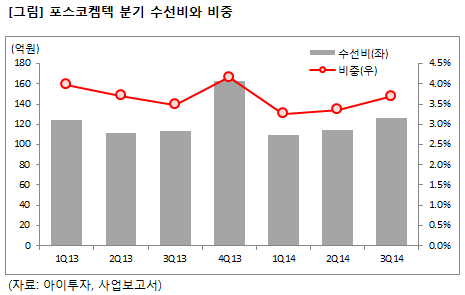 실제 포스코켐텍의 분기 수선비를 보면, 4분기에 계절적으로 증가하는 것을 확인할 수 있다. 통상 1~3분기엔 110~130억원 수준의 수선비가 발생하지만, 2013년 4분기엔 162억원이 반영됐다.