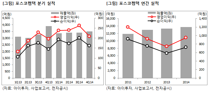 | 리스크 | ▷ 포스코에 대한 매출 의존도가 높음 ▷ 해외 자회사에 대한 채무보증 ▷ 소수 투자자에 지분이 집중됨(포스코 60%, 국민연금 6.8%, 포항공대 5%) 기준일 : 2014년 9월 30일 |