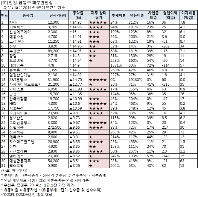 전일 8% 이상 오른 종목 가운데 재무 건전성에서 '별 다섯개'를 받은 종목은 KMH, {S&T홀딩스}, 키이스트3,830원, ▲150원, 4.08%, HRS5,355원, ▲5원, 0.09%, 고려신용정보10,890원, ▲60원, 0.55% 등 5개다.