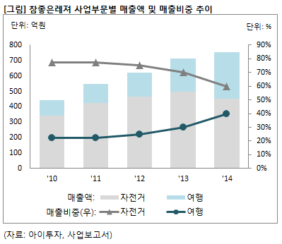 참좋은레져가 판매하는 산악(MTB)자전거, 사이클 등 고급형 자전거는 일반 자전거와 달리 마니아층을 대상으로 해 시장이 한정돼있다. 또한 수입자전거 유입으로 경쟁이 심화되는 추세다. 이런 영향인지 자전거사업부문의 매출액은 대체로 비슷한 수준을 유지하고 있다. 반면 여행사업부문 매출액은 2010년 100억원에서 지난해 302억원으로 꾸준히 늘어나고 있다. 전체 매출에서 차지하는 비중 또한 22%에서 40%로 높아졌다.