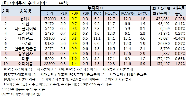6일 현대차261,500원, ▲4,000원, 1.55%가 아이투자 추천 가이드를 만족하는 종목 중에서 주가순자산배수(PBR)가 가장 낮은 종목으로 나타났다. 이는 4일 종가 기준 아이투자 추천 가이드에 해당하는 종목에 따른 것이다. 현대차261,500원, ▲4,000원, 1.55%의 PBR은 0.7배다.