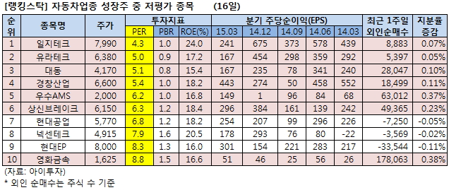 이 가운데 일지테크4,020원, ▲45원, 1.13%의 PER이 4.3배로 자동차 업종 성장주 중에서 가장 낮았다. ROE는 24.0%, PBR은 1.0배다. 그 외 유라테크7,540원, ▲60원, 0.8%, 대동9,700원, ▲290원, 3.08%, 경창산업1,470원, ▲51원, 3.59%, 우수AMS2,535원, ▲30원, 1.2%, 상신브레이크2,610원, ▲5원, 0.19%, 현대공업6,030원, ▲120원, 2.03%, 넥센테크, HDC현대EP4,045원, ▲70원, 1.76%, 영화금속880원, ▼-4원, -0.45% 등이 상위 10선에 해당했다.