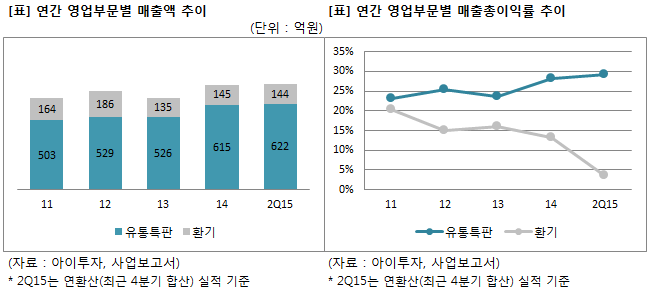 유통특판부문의 수익성도 개선됐다. 증권업계에 따르면 B2B 시장에서 최저입찰제로 형성됐던 저수익 구조가 업계 구조조정에 따라 점차 회복되면서 수익성이 개선됐다. 유통특판부문 매출총이익률은 지난 2011년 23%에서 지난해 28%로 상승했다. 지난 2분기도 29%로 지난해말 대비 1%P 높아졌다.