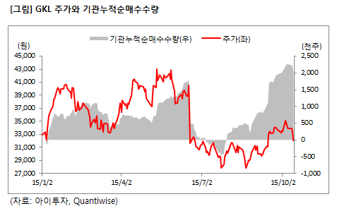 증권업계에 따르면 기관은 지난 9월부터 GKL 지분을 늘리고 있다. 지난 9월부터 전일까지 29일(거래일 기준) 동안 기관이 사들인 주식 수 는 135만8004주로 발행주식수의 2.20%에 달하는 수량이다. 하지만 같은 기간 주가는 2.2% 상승해 큰 변동은 없었다.