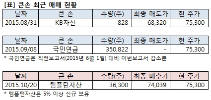 KB자산운용은 대림산업의 지분을 확대했다고 지난 9월 4일 공시했다. 보고서 작성 기준일인 지난 8월 31일 기준 보유량은 8.07%로 직전보고서(2015년 7월 31일) 대비 1.26%P(44만1407주) 증가했다. 반면, 최근 거래일은 지난 8월 31일로 828주를 평균 6만8320원에 장내매도했다.