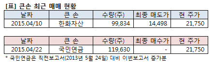 한화자산은 티씨케이 지분을 일부 축소했다고 2015년 4월 14일 금감원 전자공시를 통해 밝혔다. 이에 따르면 보고서 작성기준일인 2015년 4월 13일 기준 지분율은 7.49%로 직전보고서(2014년 10월 10일) 대비 1.03%P(11만9873주) 감소했다. 최근 거래일은 2015년 4월 10일로 9만9834주를 평균 1만4498원에 장내매도 했다.