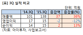 반면 순이익은 13% 증가한 15억원을 기록했다. 금융손익(금융수익 – 금융비용)이 –3678만원으로, 전년 동기 –2억7677만원 대비 적자 폭이 줄어든 영향이다. 이자비용이 5507만원으로, 전년 동기 2억814만원 대비 감소했다. 또한 지난해 3분기에 발생한 파생상품평가손실 1억1128만원도 이번 분기엔 발생하지 않았다.
