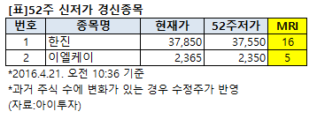 21일 증시에서 장중 52주 최저가를 경신한 종목은 한진20,050원, ▼-350원, -1.72% 포함 총 2개로 나타났다.