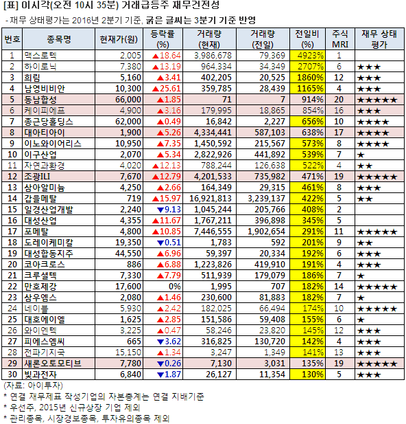 거래량은 시장 참여자의 관심을 가늠하는 척도가 되기도 합니다. 다만, 이를 토대로 '묻지마 투자'에 나서는 것은 현명한 투자와는 거리가 멉니다. 전일 대비 거래량이 많이 늘어난 기업의 투자매력도 점수와 재무상태를 점검해봅니다.