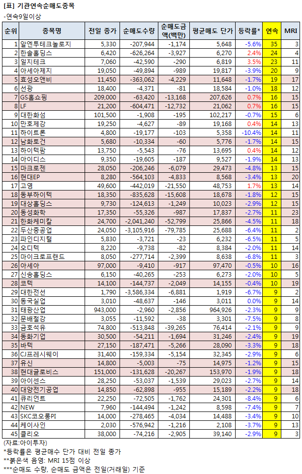 전일까지 기관 투자자가 9일 이상 연속 순매도한 종목은 대양전기공업 포함 모두 45개다. 알엔투테크놀로지5,500원, ▲30원, 0.55%(35일), 한솔홀딩스3,120원, ▲20원, 0.65%(24일), 일지테크4,065원, ▲45원, 1.12%(23일) 등이 상위권에 올랐다. 새로 목록에 포함된 기업은 큐리언트29,250원, ▲1,150원, 4.09%, NEW2,120원, ▲10원, 0.47% 등 총 17개다.