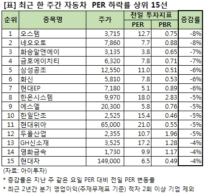 [주간 PER 변동] 오스템 12.7배, 자동차 하락률 1위