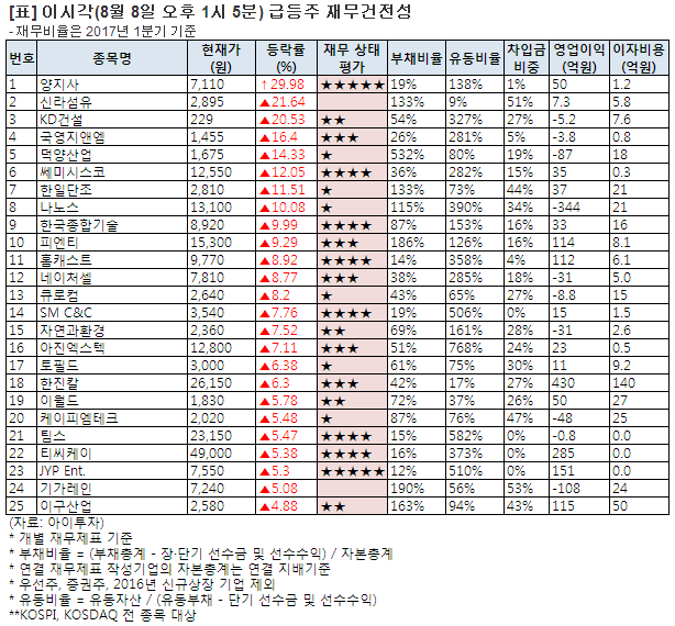 같은 시각 한일단조2,175원, ▼-5원, -0.23%, 한국종합기술4,780원, ▲130원, 2.8%, 아진엑스텍8,970원, ▲70원, 0.79% 등도 상승 폭이 크다. 전일 대비 5% 이상 오른 종목 가운데 재무건전성에서 '별 다섯 개'를 받은 종목은 JYP Ent.68,400원, ▼-200원, -0.29% 등 2개다.