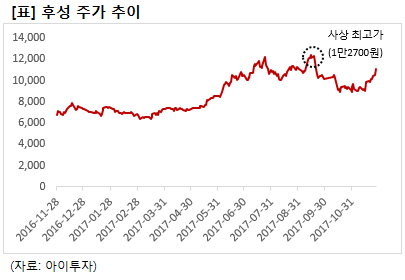 후성 주가는 지난 9월 13일에 사상 최고가인 1만2700원에 도달했다. 이후 다소 조정을 받아 8000원대까지 내렸으나, 11월 들어 24% 가량 상승해 그간의 하락을 다소 보완했다. 현재 주가는 최고가 대비 약 13% 낮은 수준이다.