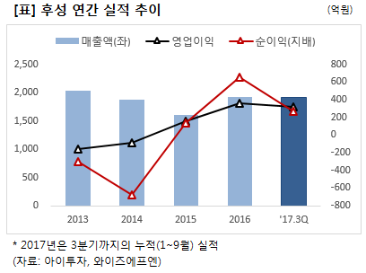 올해는 이미 지난해 대비 성장이 유력하다. 3분기까지의 누적(1월~9월) 매출액은 1910억원으로 2016년 연간치의 99%를 달성했다. 영업이익은 지난해 연간치의 87%인 317억원이다.